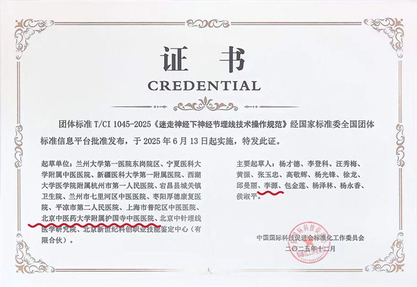 李源医生参与制定《手卡压式星状神经节埋线技术操作》和《迷走神经下神经节埋线技术操作技术》两项团体标准,该治疗方式已在临床中开展使用,深受患者好评。
